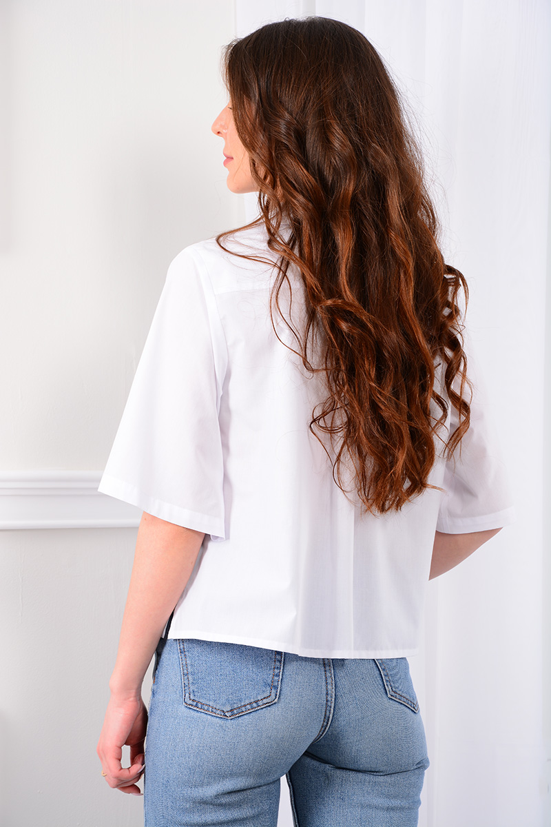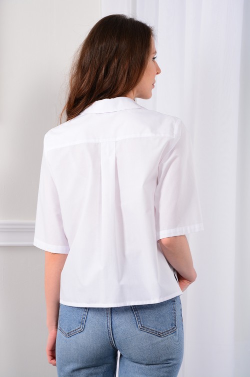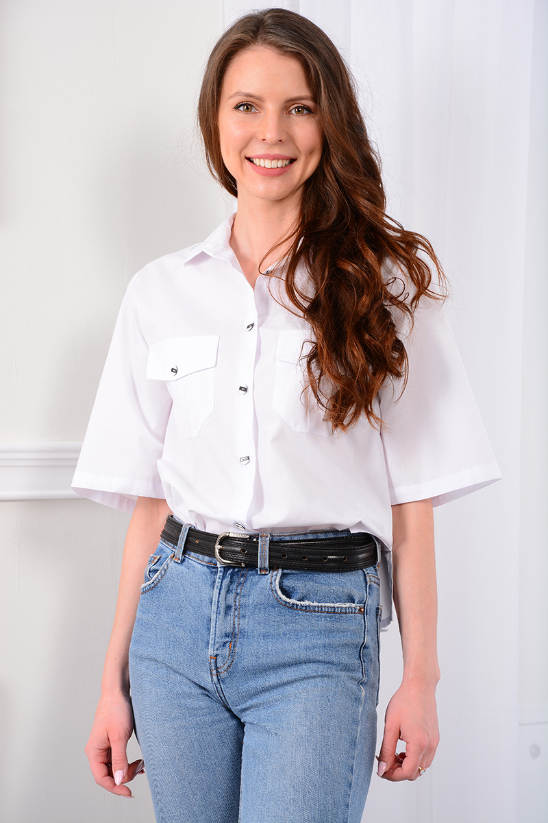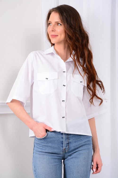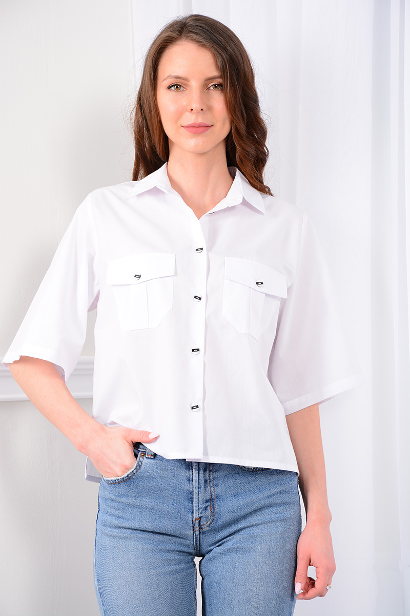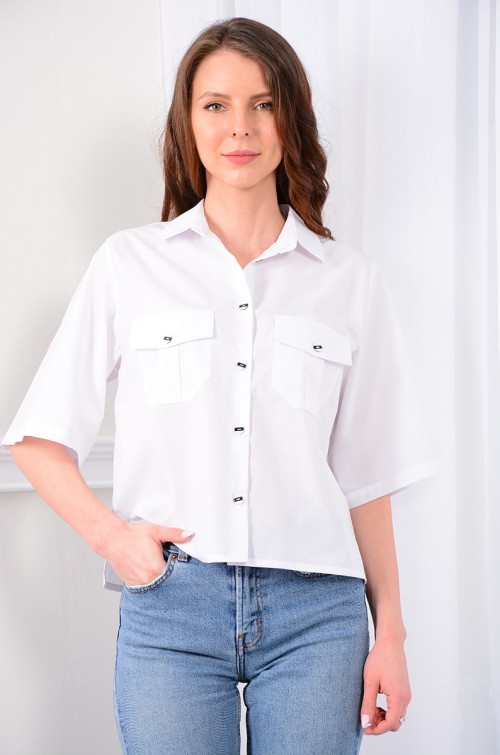 Блузка-рубашка свободного кроя - «оверсайз». Воротник рубашечного типа с отрезной стойкой и застежкой по переду на петли и контрастные пуговицы. По спинке - кокетка и встречная складка по центру. По передним полочкам фигурной формы накладные карманы с клапанами. Низ прямой, в боковых швах разрезы. Рукав с углубленной проймой, втачной. Для 42 размера длина рукава 32 см., длина изделия по спинке 53 см.