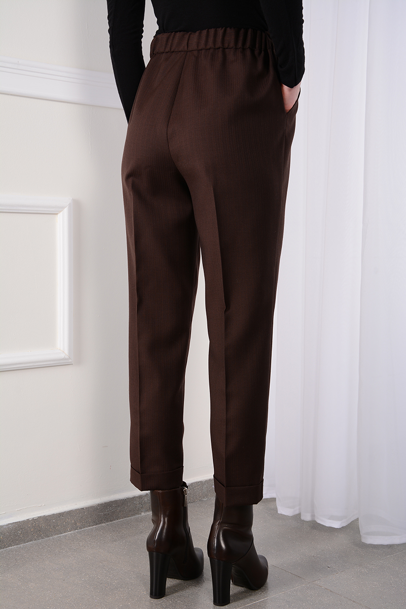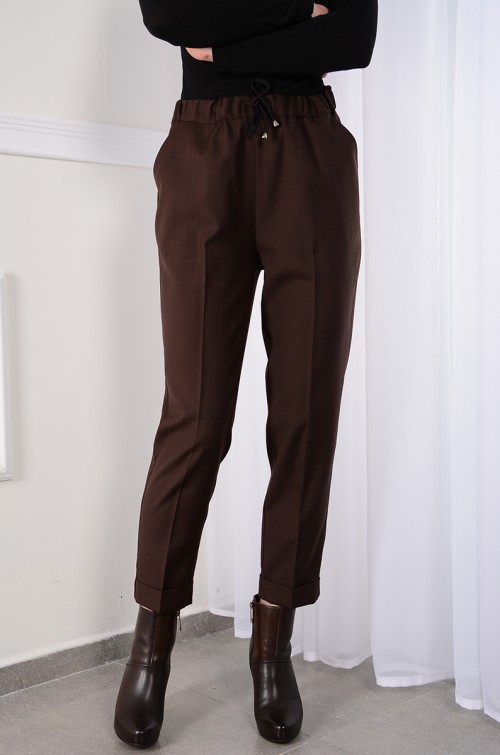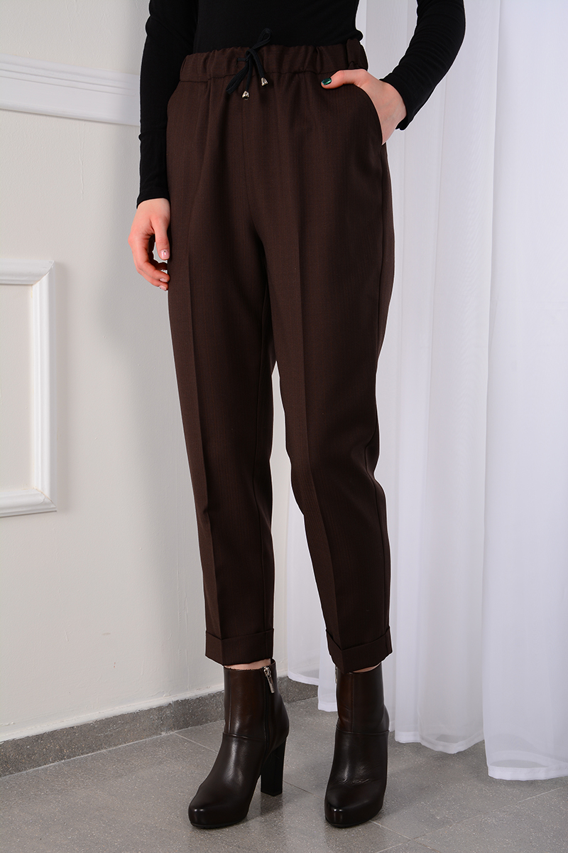 Брюки женские из костюмного полушерстяного полотна жаккардового плетения в полоску. Брюки свободного прилегания по бедрам и зауженные к низу, длиной 7/8. Пояс на эластичной тесьме с кулисой и втянутым шнурком. Вход в карман фигурный, наклонный к боковому шву. Длина 89 см по боковому шву, 65см по шаговому шву для 42 размера.