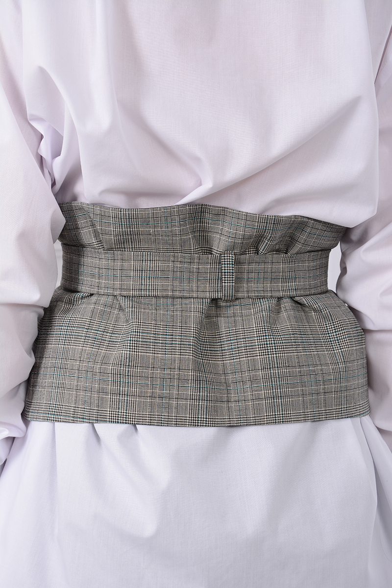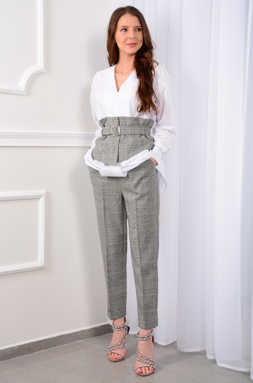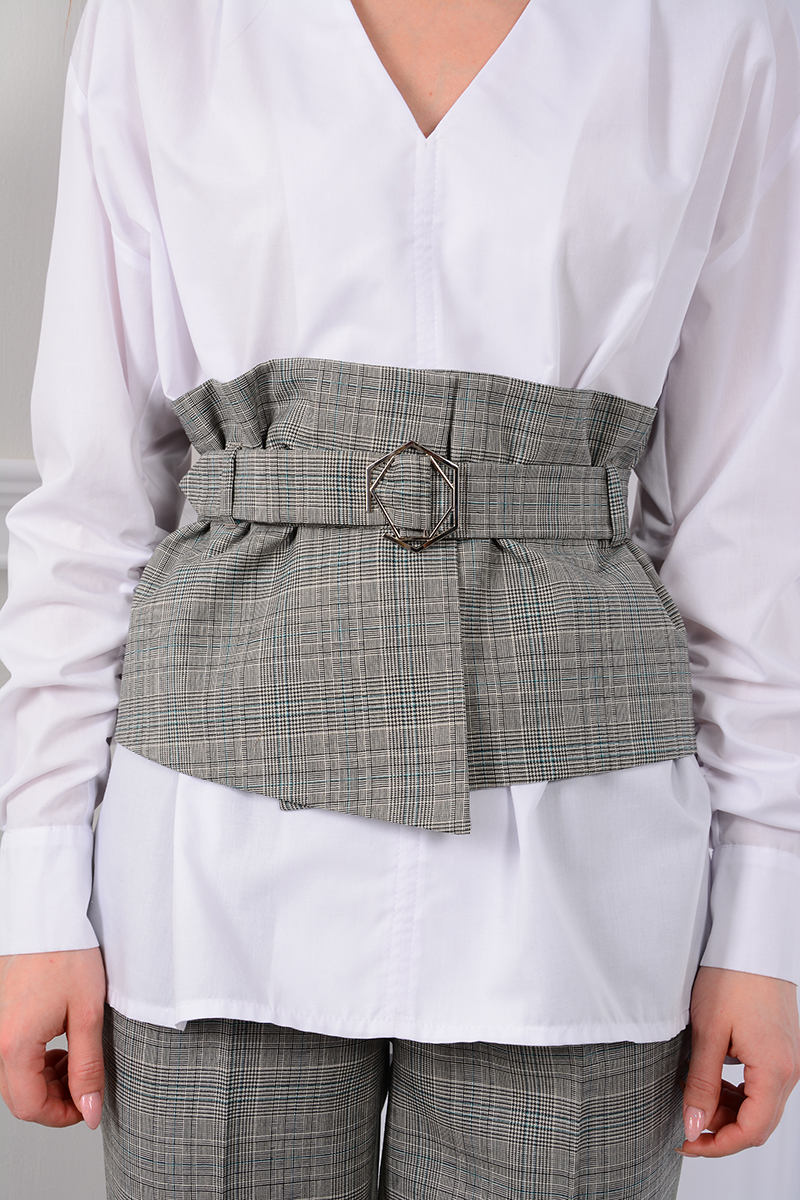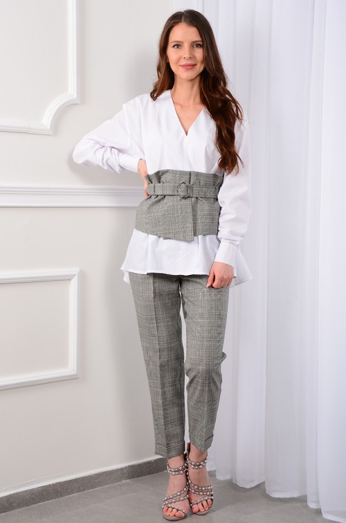 Оригинально выглядит женский комплект от LM, состоящий из блузы, брюк и широкого структурированного пояса-корсета. Новый образ - идеальный вариант как для офиса, так и для вечерних мероприятий. Блуза "оверсайз" свободного силуэта. Рукава со спущенным плечом, длинные втачные одношовные. По шву рукава есть легкая сборка резиночкой, что позволяет создать дополнительный объем. Низ рукавов обработан широкими манжетами на пуговичках. Вырез горловины V-образный, обработан широкой обтачкой. По плечевым швам на спинке и полочках заложены глубокие складки. Длина изделия для 42 размера по переду 46,5 см, по центру спинке 75 см. Брюки свободного прилегания по бедрам и зауженные к низу, длинной 7/8. Пояс на эластичной тесьме с кулисой и втянутым шнурком. Вход в карман фигурный, наклонный к боковому шву. С помощью корсетного пояса с металлической пряжкой офисный комплект станет чуть менее официальным и более женственным. Пояс не только усиливает впечатление от комплекта, но и подкорректирует фигуру, «подтянув» живот!