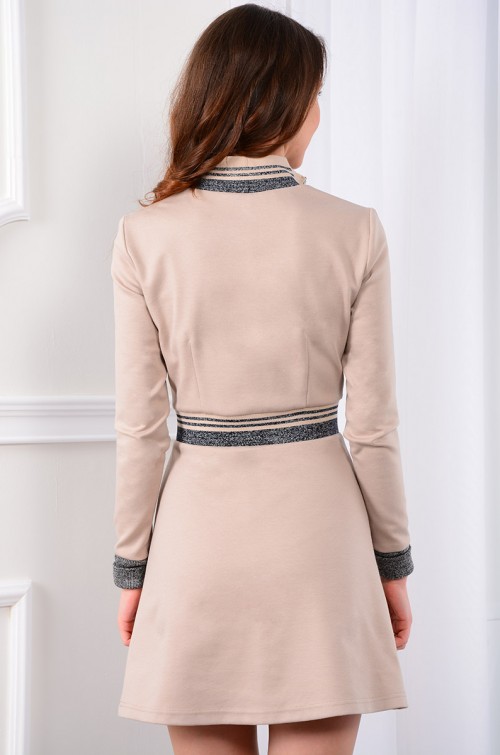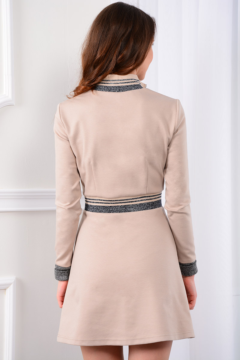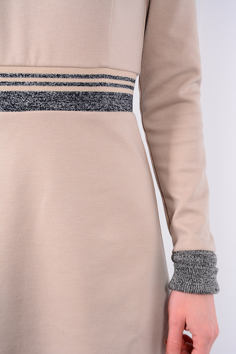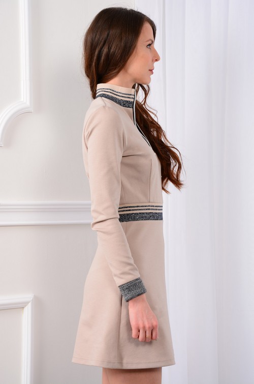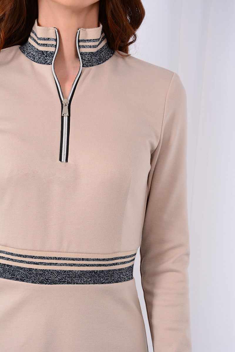 Платье в стиле спорт-шик отличается комфортностью и не сковывает движений. Модный фасон, выделяющийся четкостью линий - это отображение повседневной практичности и функциональности. Популярный бежевый цвет трикотажного полотна умело обыгран контрастной трикотажной эластичной лентой. Воротник-стойка с застежкой на тесьму-молнию. Рукава втачные длинные, с эластичным манжетом. Классическая цветовая гамма с элементами контрастной отделки придаёт образу завершенность. Повседневный, привычный, но при этом выразительный образ.