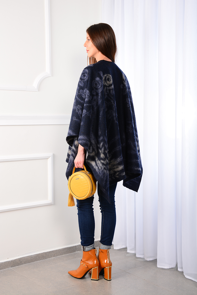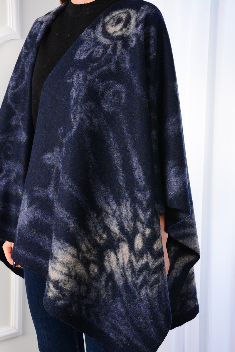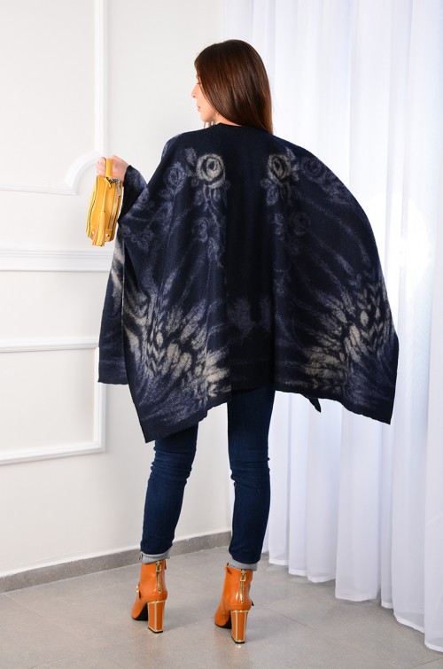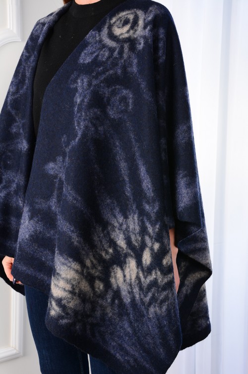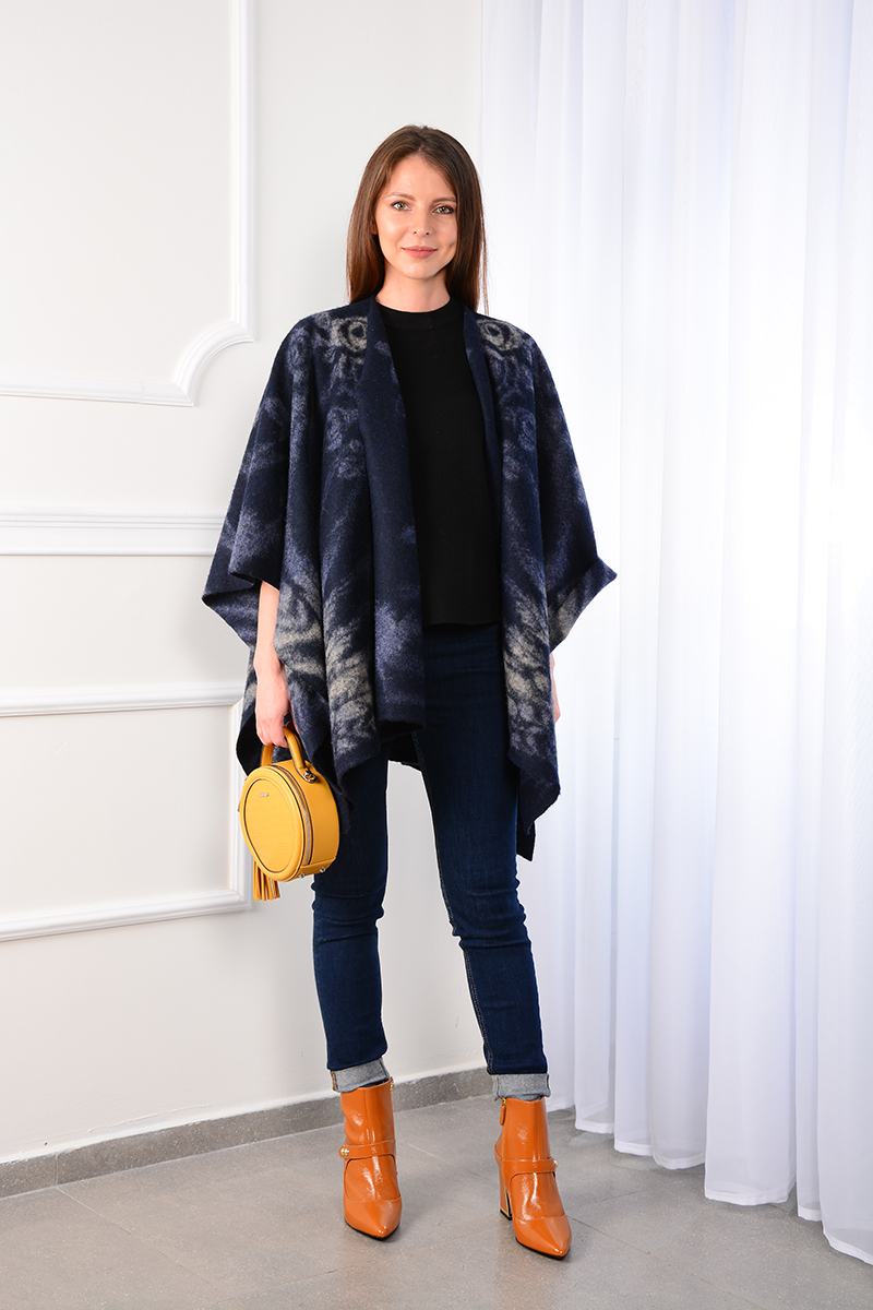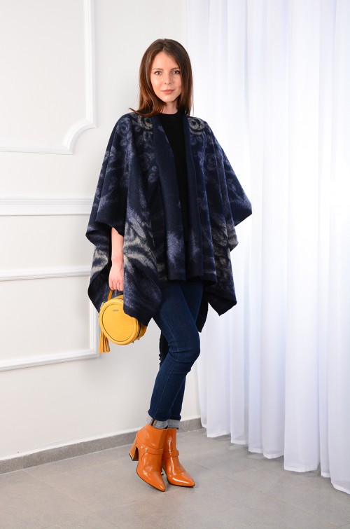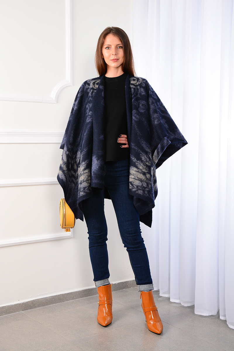 Пончо считаются отличной альтернативой кардигану или пуловеру. Особенностью пончо считается свободный крой, подразумевающий удобство и комфорт в ношении. С его помощью легко корректируется фигура, подчеркиваются достоинства и скрываются недостатки. Данная модель представляет собой прямоугольник 125см*156см из шерстяного материала типа вареная шерсть.
