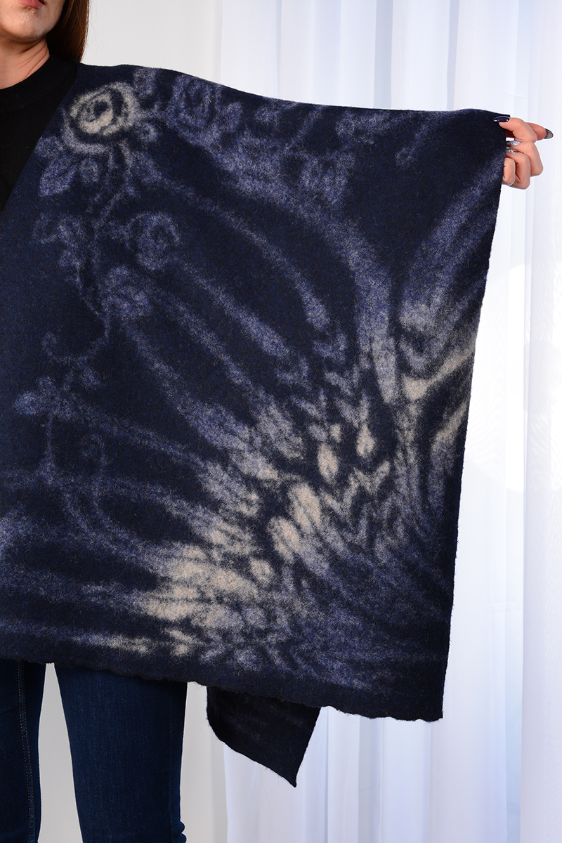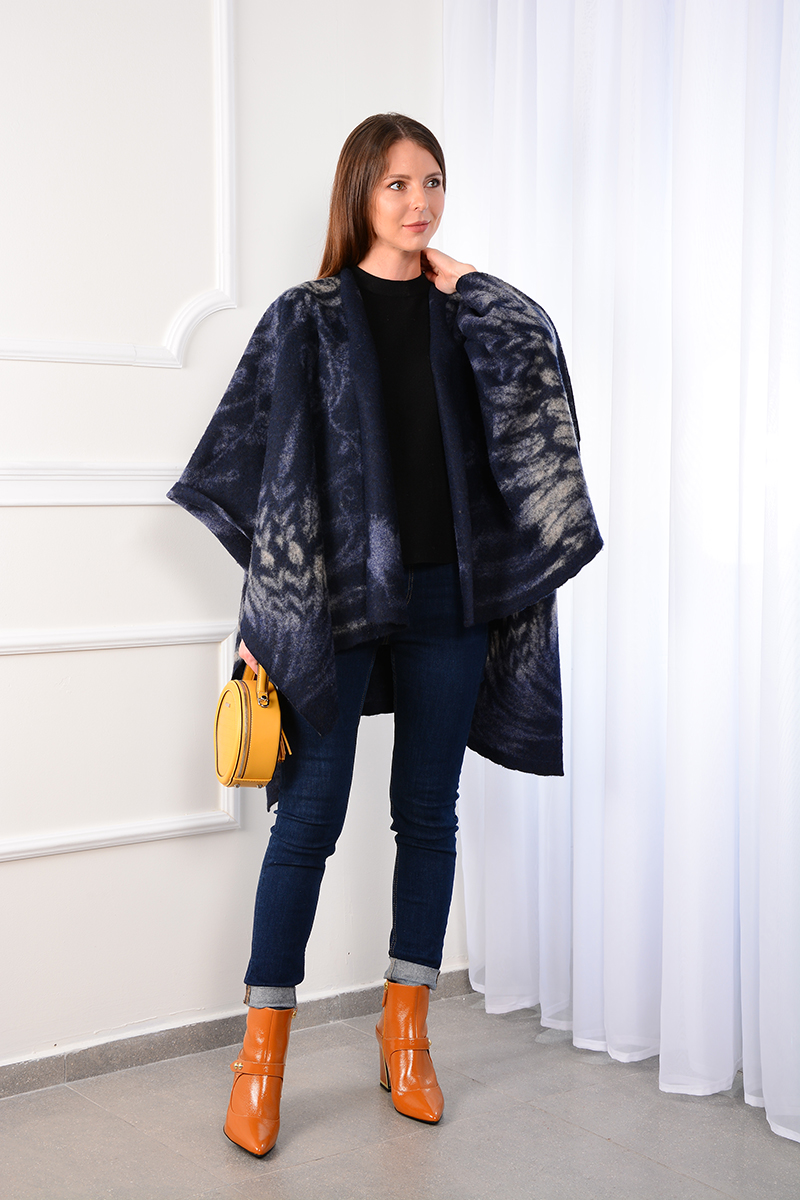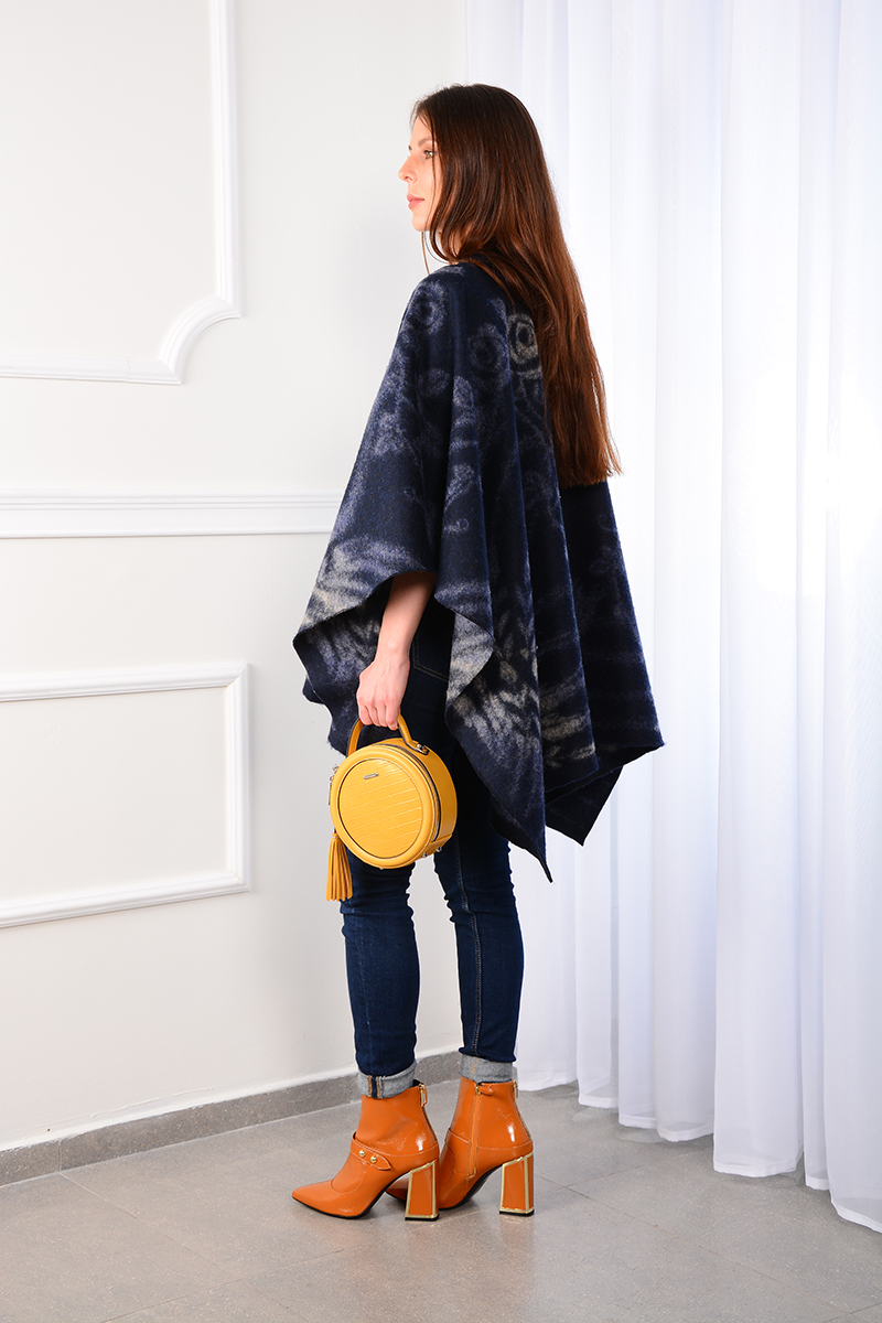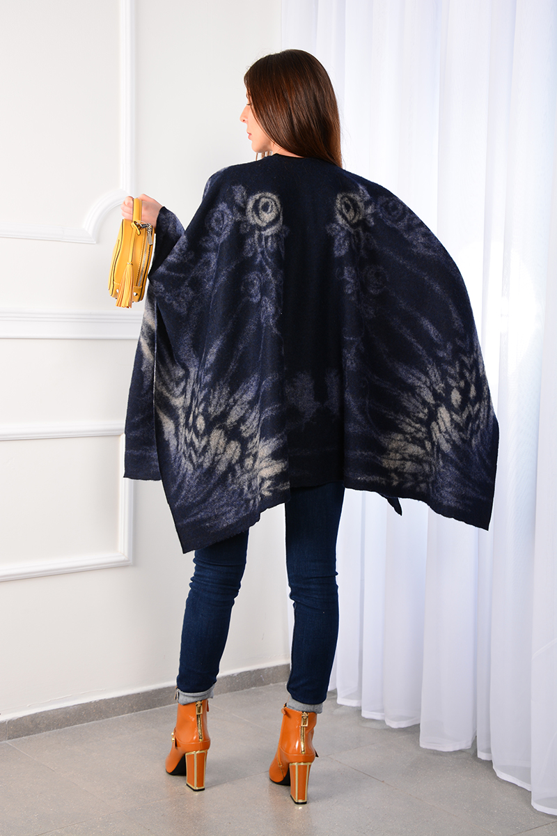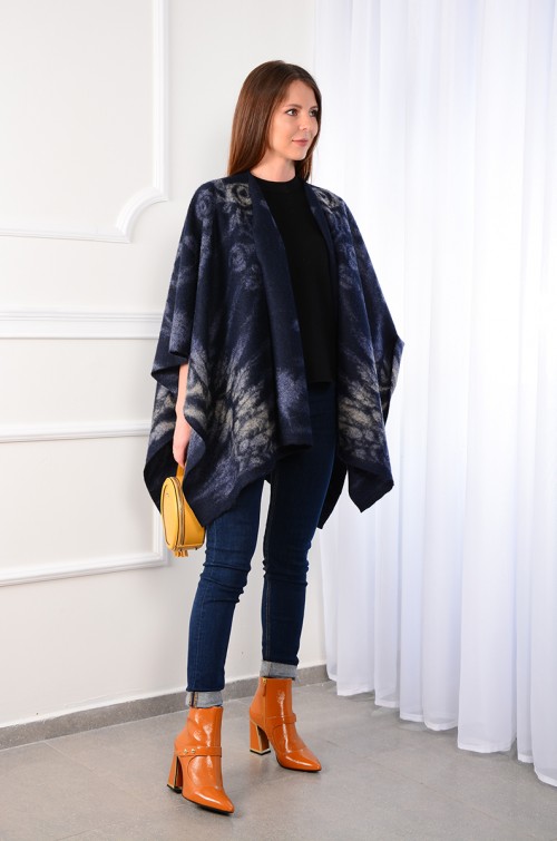 Пончо считаются отличной альтернативой кардигану или пуловеру. Особенностью пончо считается свободный крой, подразумевающий удобство и комфорт в ношении. С его помощью легко корректируется фигура, подчеркиваются достоинства и скрываются недостатки. Данная модель представляет собой прямоугольник 125см*156см из шерстяного материала типа вареная шерсть.
