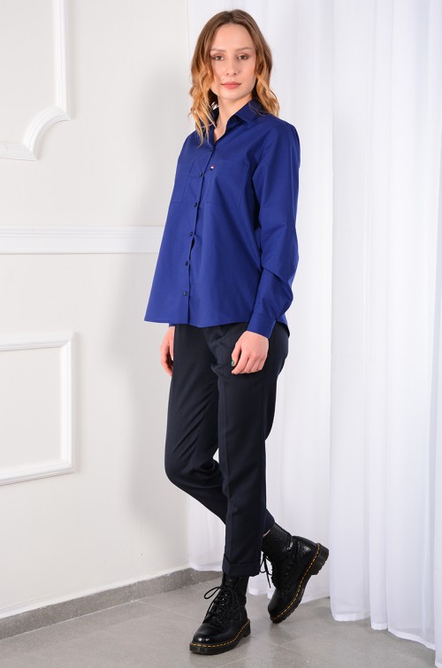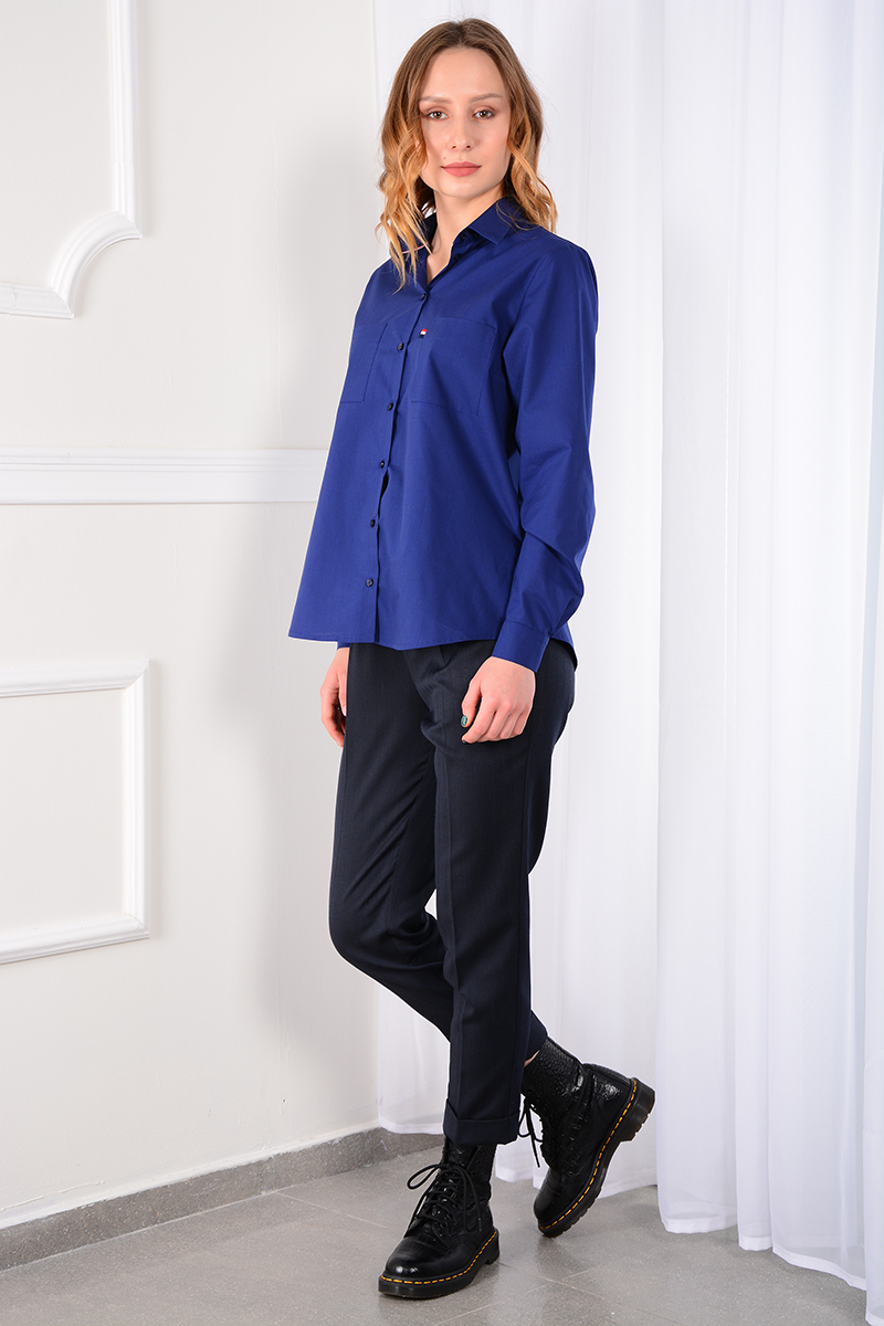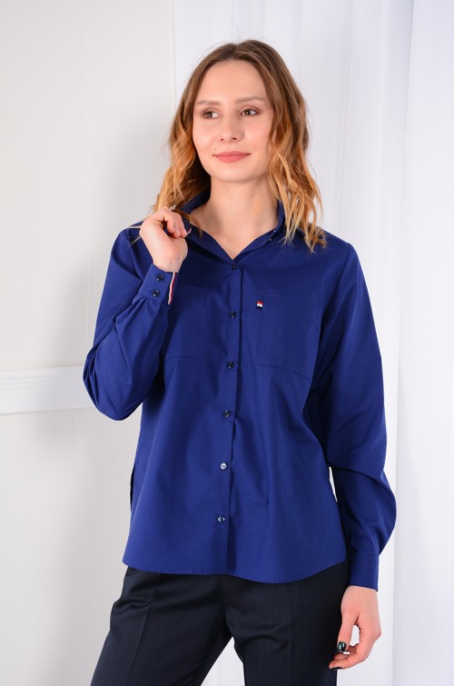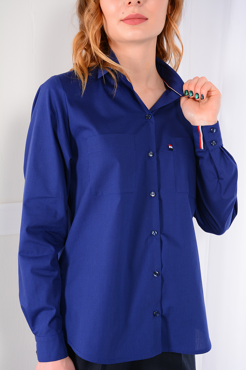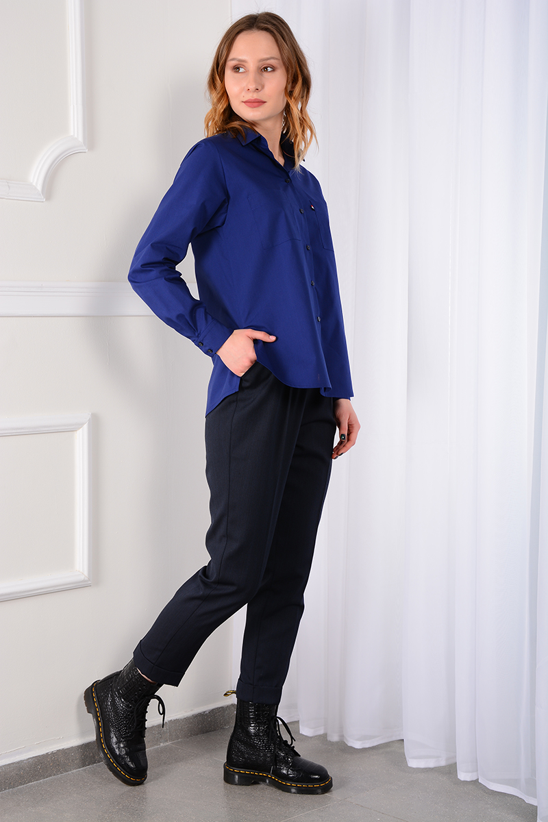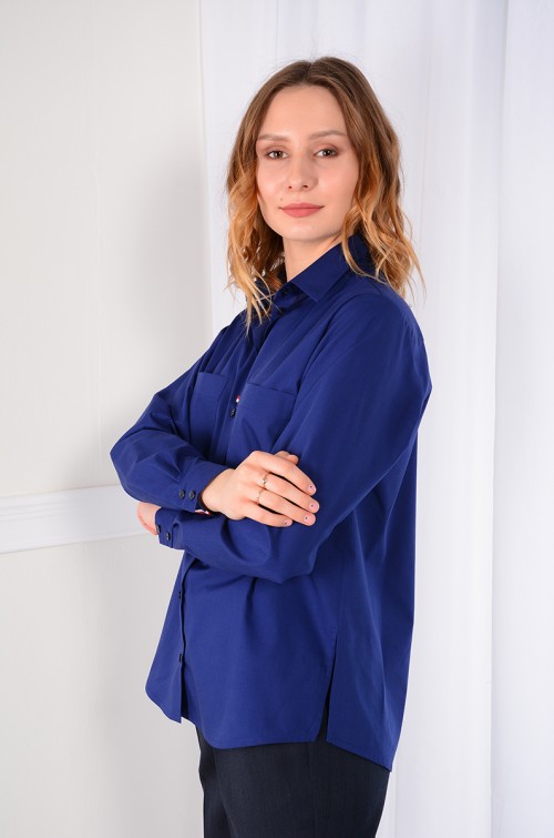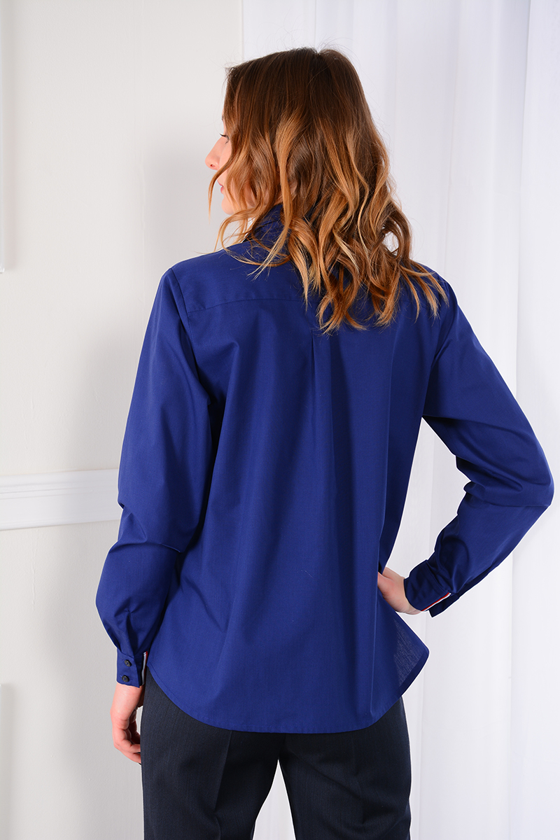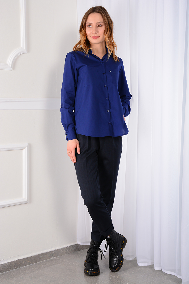 Рубашка мужского кроя без вытачек. Рукав втачной с манжетой на 2 петли и пуговицы. Воротник отложной со стойкой. Кокетка на спинке, спинка со складкой. Низ прямой, по бокам разрезы. Спинка длиннее переда.