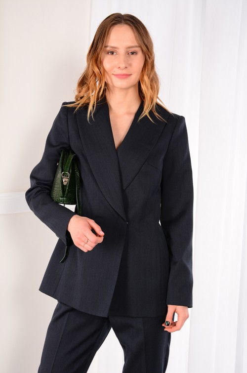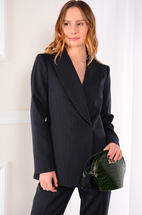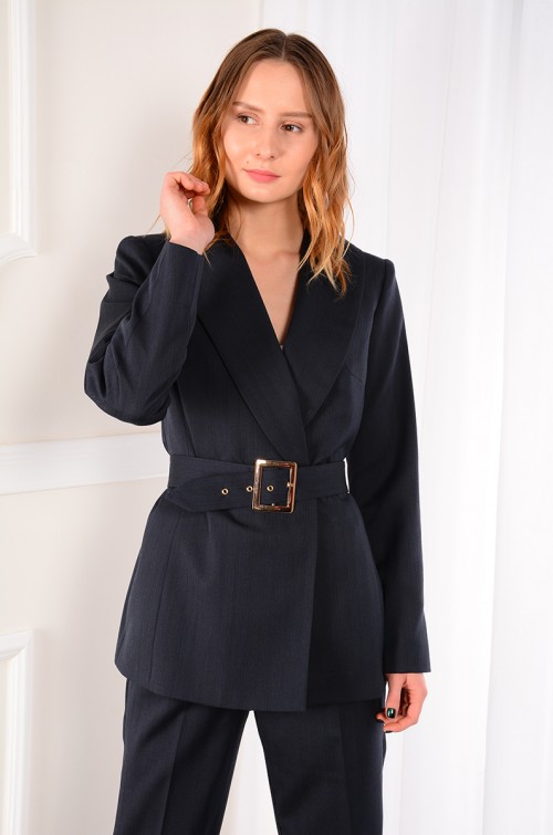 Элегантный удлиненный жакет из костюмной ткани: полушерстяного полотна жаккардового плетения в полоску. Силуэт полуприлегающий, с застежкой на две потайные кнопки. Воротник жакета шалевый. Рукава втачные двухшовные. Изделие на подкладке. Жакет дополнен съемным поясом с металлической пряжкой. Рекомендуем жакет комплектовать с брюками КВ 33с и топом LM01 белого или голубого цвета (на выбор).